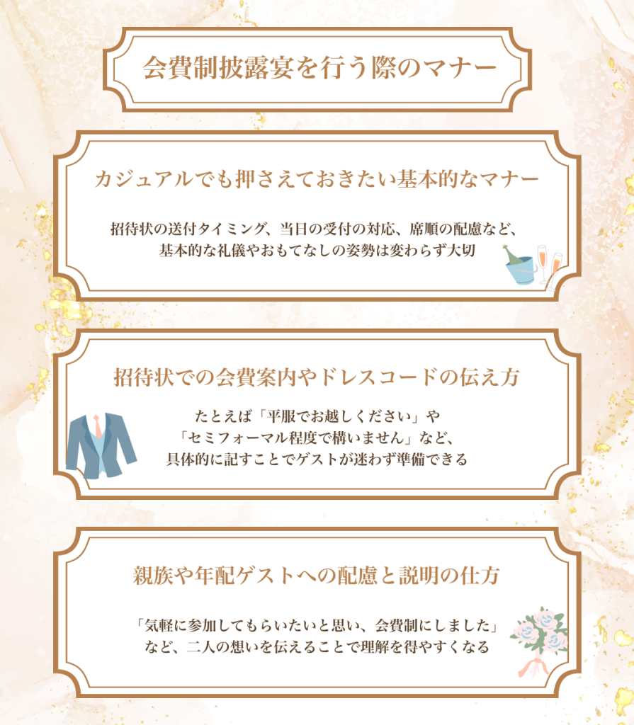 結婚パーティを会費制で開催する場合、開催側として守るべきマナーはありますか?